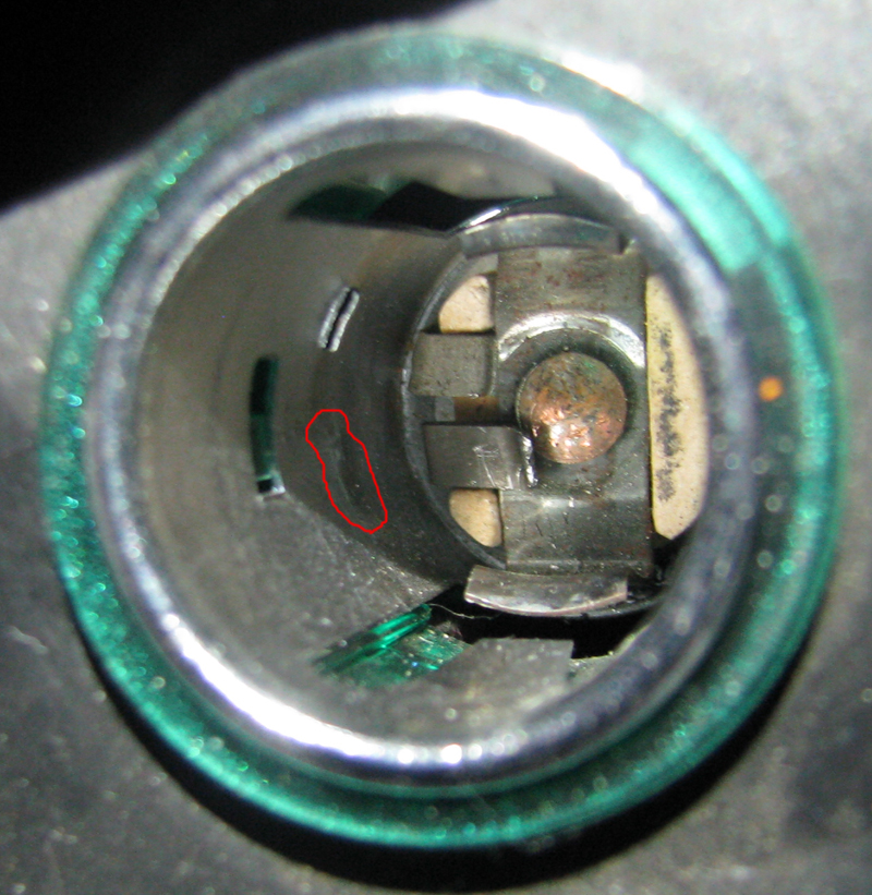 На первом фото зелеными стрелками показаны лепестки плюсовой клеммы, за которыми нет стенки минусовой клеммы. Но вот есть еще один лепесток. (красная стрелка). Между ним (плюсовым) и стенкой (минусово) меньше миллиметра! Стоит чуть под углом вставить зарядку — сразу искрит и коротит. Так-то предохранитель и перегорел. Чтоб не менять из-за конструктивного идиотизма предохранители по три раза на неделе, можно этот лепесток просто подогнуть. (см. фото 2). |