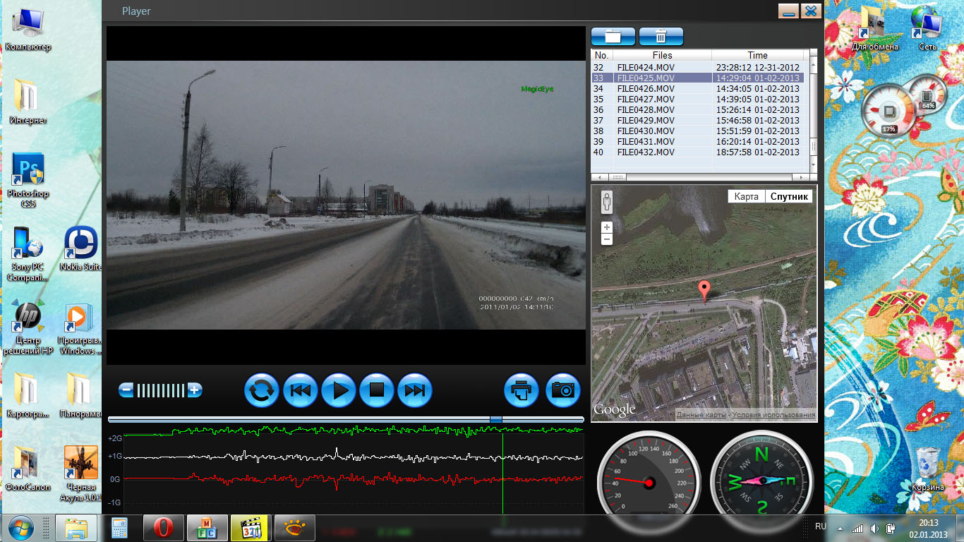 Выкладываю несколько фотографий: ночная и дневная съемка видеорегистратором MagicEye HD70G. Одна из фото - окно плеера (записан в самом регистраторе), где проигрывается один из файлов.